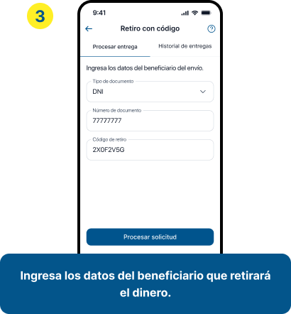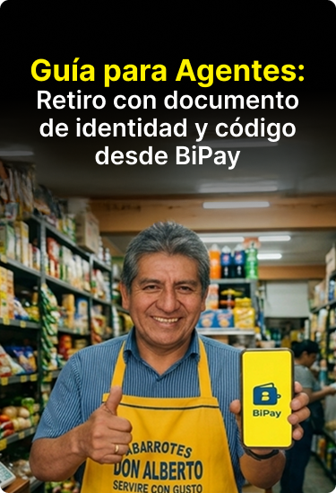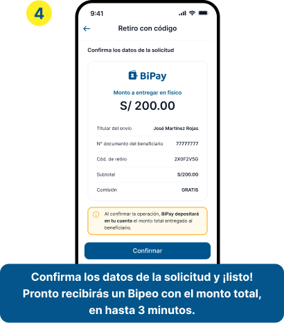 Solo solicita al beneficiario su documento de identidad y código de retiro para procesar la entrega del efectivo, rápido y seguro desde BiPay