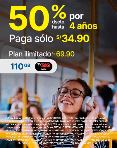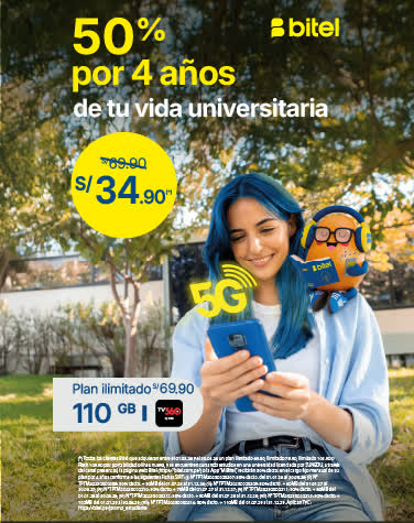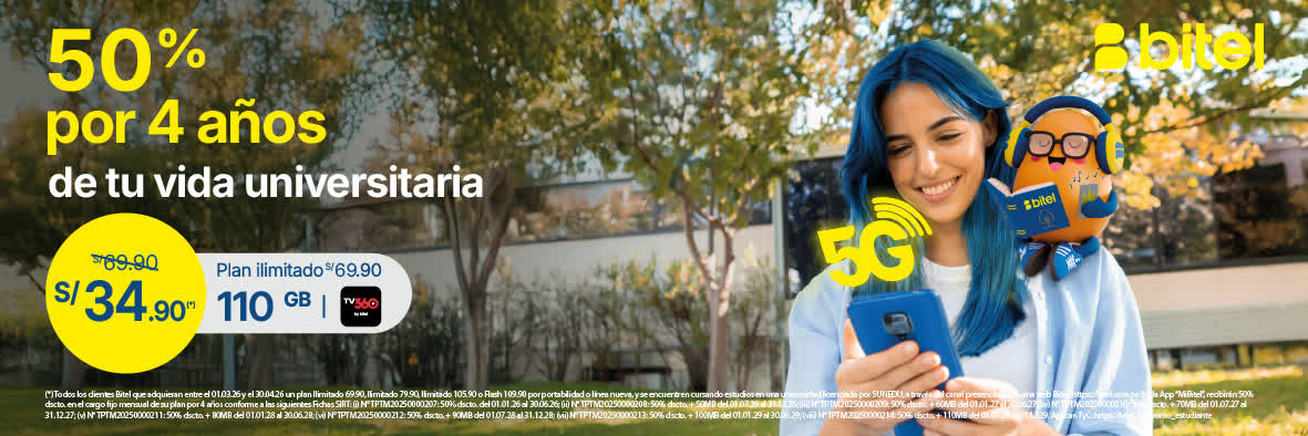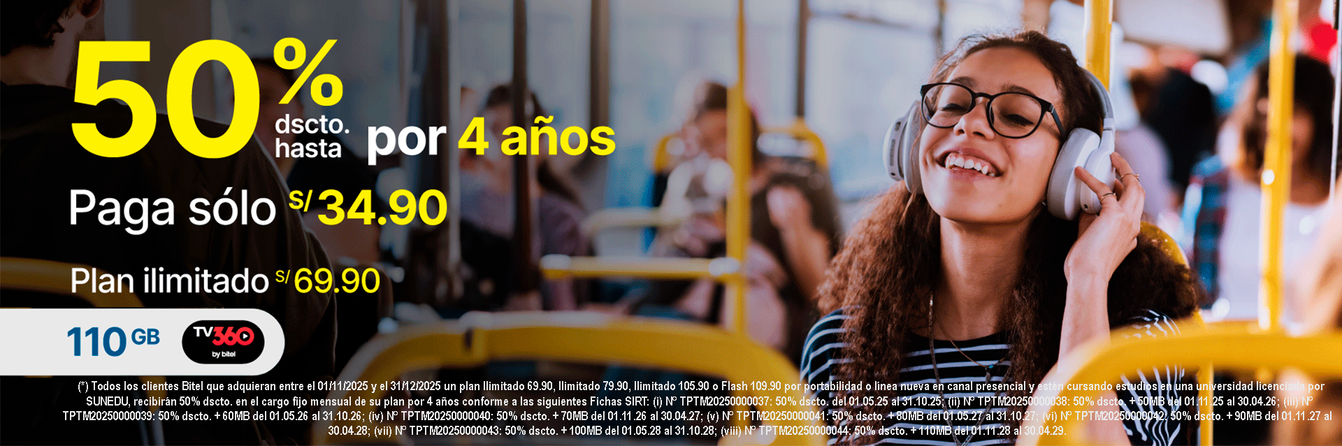 (*) Todos los clientes Bitel que adquieran entre el 01/11/2025 y el 31/12/2025 un plan Ilimitado 69.90, Ilimitado 79.90, Ilimitado 105.90 o Flash 109.90 por portabilidad o línea nueva en canal presencial y estén cursando estudios en una universidad licenciada por SUNEDU, recibirán 50% dscto. en el cargo fijo mensual de su plan por 4 años conforme a las siguientes Fichas SIRT: (i) N° TPTM20250000037: 50% dscto. del 01.05.25 al 31.10.25; (ii) N° TPTM20250000038: 50% dscto. + 50MB del 01.11.25 al 30.04.26; (iii) N° TPTM20250000039: 50% dscto. + 60MB del 01.05.26 al 31.10.26; (iv) N° TPTM20250000040: 50% dscto. + 70MB del 01.11.26 al 30.04.27; (v) N° TPTM20250000041: 50% dscto. + 80MB del 01.05.27 al 31.10.27; (vi) N° TPTM20250000042: 50% dscto. + 90MB del 01.11.27 al 30.04.28; (vii) N° TPTM20250000043: 50% dscto. + 100MB del 01.05.28 al 31.10.28; (viii) N° TPTM20250000044: 50% dscto. + 110MB del 01.11.28 al 30.04.29.