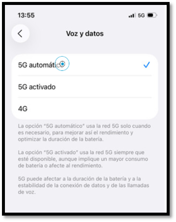 5G/4G/3G (Automático): el teléfono usará 5G cuando esté disponible y cambiará automáticamente a 4G o 3G si la señal baja.