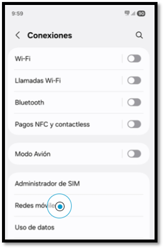 2. Dirígete a Conexiones, Redes móviles o menú similar.
