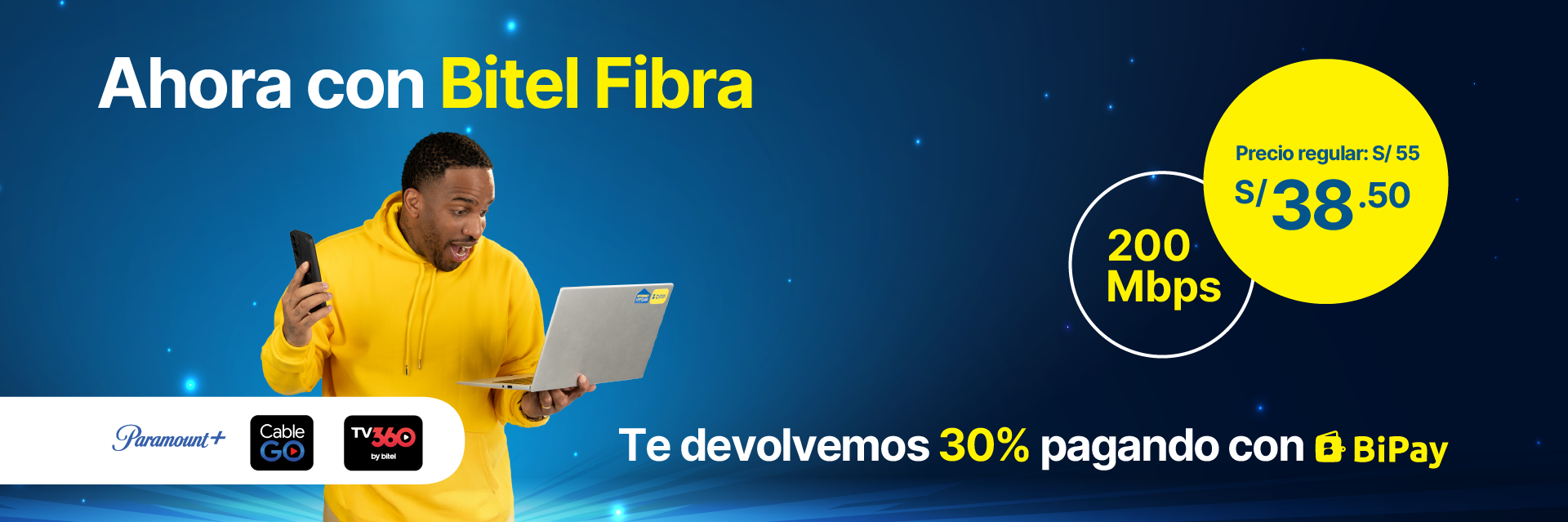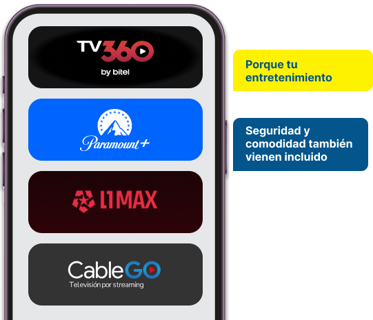 Con tu plan de internet de fibra óptica Bitel, no solo navegas a toda velocidad: también disfrutas de acceso exclusivo a plataformas como TV360, Paramount+, CableGO, L1MAX y protección digital con Bitdefender.