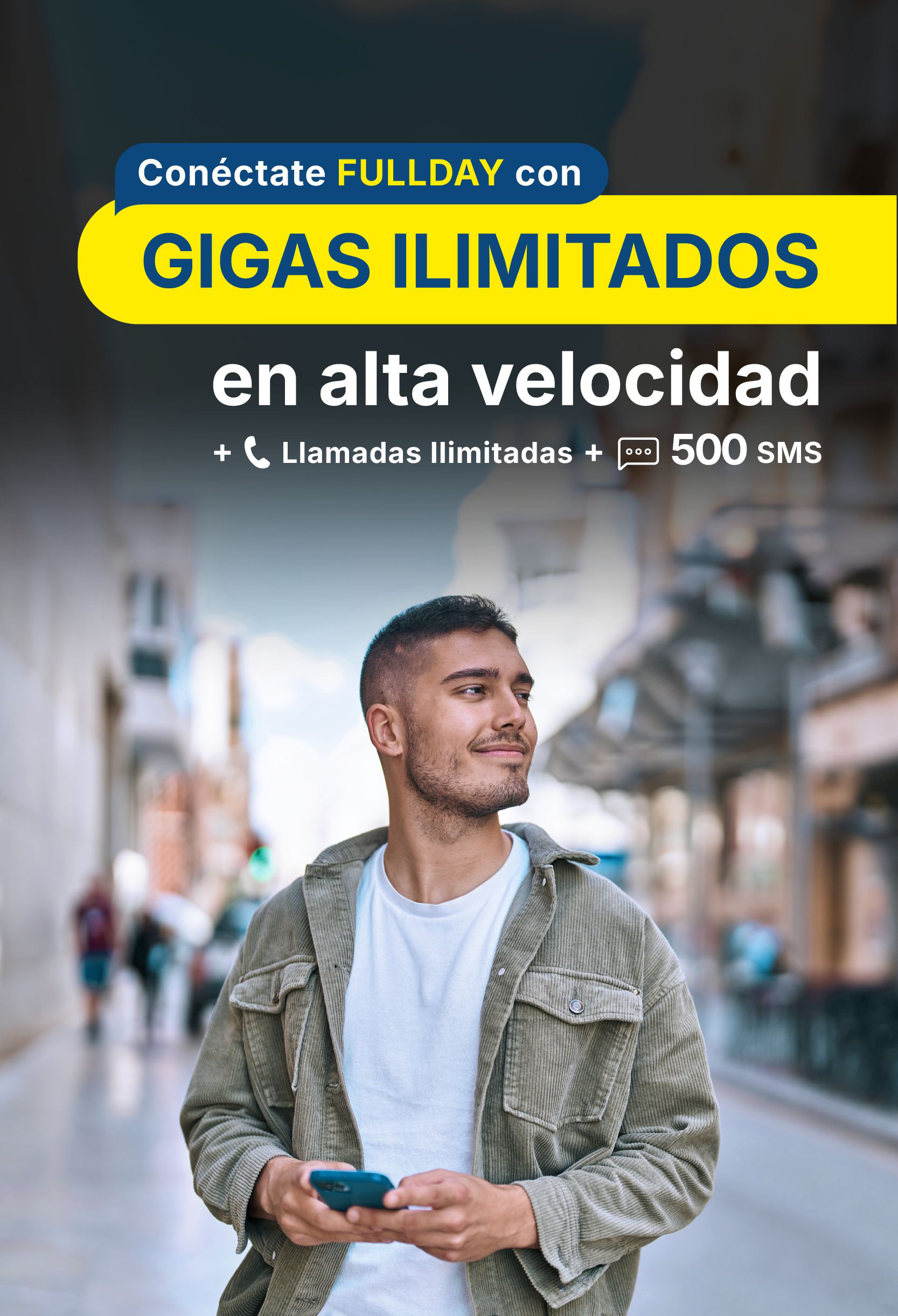 Activa el paquete Fullday y obtén GB ILIMITADOS en ALTA VELOCIDAD + llamadas ilimitadas + 1000 SMS hasta las 11:59 p.m. del mismo día de la compra.